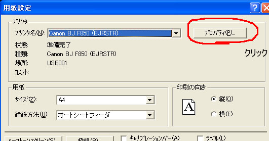 | まず、「ファイル」→「用紙設定」を選んで、「プロパティー」をクリックしてドライバーの設定を 呼び出します。 |