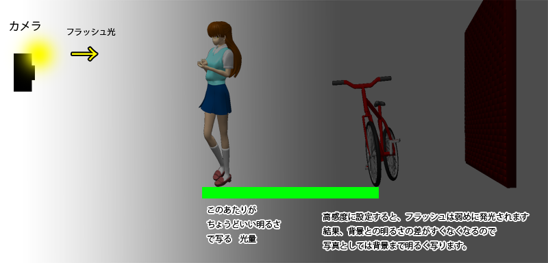 高感度では、より少ない光で適正露出となるため、フラッシュの発光量が減ります、そのため、この図では低感度より暗い範囲が広くなっているので 暗い印象になってますが、被写体のあたりの明るさと背景の壁や自転車あたりの明るさの差が小さくなるので、結果としては、写真は背景まで明るく写ります。