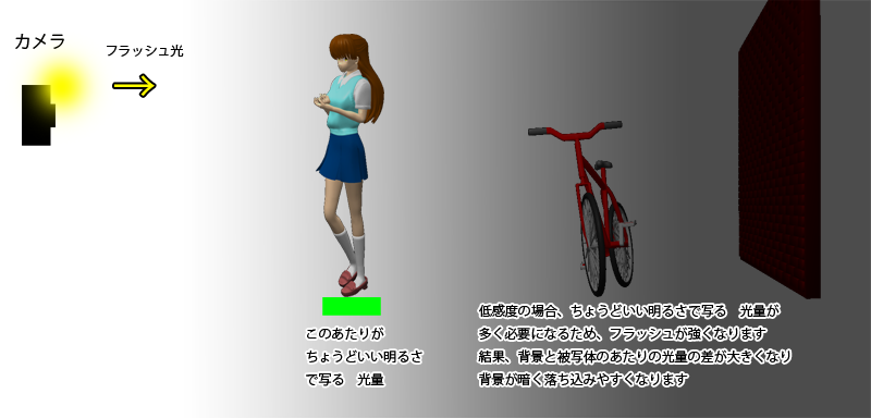 図にすると、ちょうどこんな感じとなります、高感度でフラッシュを利用した場合